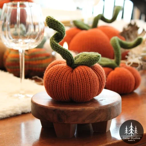 Cozy hand knit pumpkins are fully knit from body to leaf and stem. Flexible and posable stems make these autumn pumpkins unique. Complete your Fall, Halloween or Thanksgiving decor from table to mantel with these beautiful pumpkins.